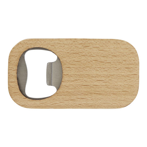 Apribottiglie in acciaio inossidabile con superficie in legno. Perfetto come omaggio in fiere e conferenze.