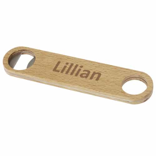 Apribottiglie prodotto in acciaio inossidabile con superficie in legno. Dispone di un gancio sul manico. Valorizza la tua azienda con un gadget distintivo.