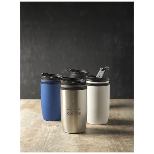 Questo bicchiere compatto e resistente è ideale per i viaggi. Il tappo è antiperdita grazie alla chiusura ermetica con apertura a scatto. Il bicchiere è dotato di una struttura sottovuoto a doppia parete in acciaio inox con isolamento in rame che mantiene le bevande al caldo per 8 ore e al fresco per 24 ore. La sua particolare struttura inoltre evita la formazione di condensa sulla superficie esterna. Capacità massima 380 ml. Presentato in confezione regalo Avenue. Pensato per lasciare un ricordo positivo del tuo brand.