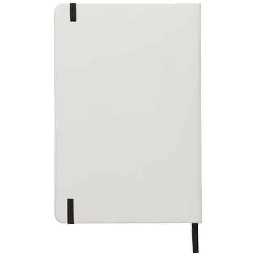Notebook A5 bianco con chiusura elastica colorata e segnapagina coordinato. Composto da 80 pagine a righe (60g/m²). Stampa digitale disponibile per la copertina. Perfetto per kit di benvenuto aziendali.