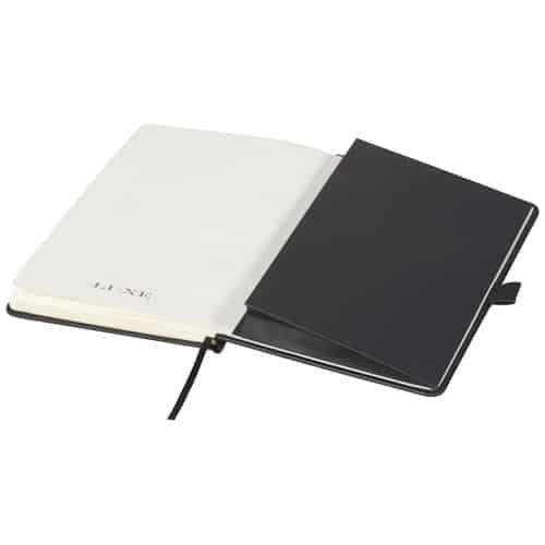 Taccuino con design esclusivo (formato A5) caratterizzato dalla carta da 80 g/m², 80 fogli a righe di color crema con tasca posteriore interna e porta penna. Confezionata in una scatola regalo “LUXE”. Pensato per lasciare un ricordo positivo del tuo brand.