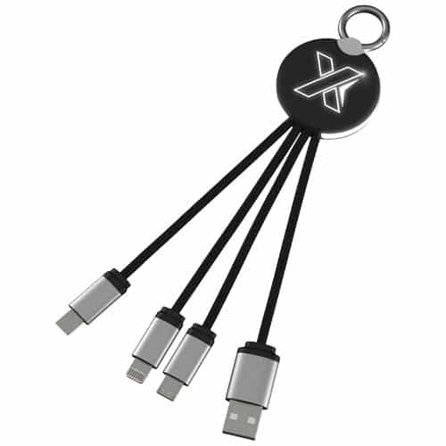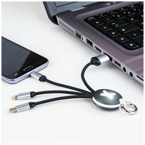 Cavo di ricarica con logo luminoso, finitura in gomma e dotato di tre connettori (tipo C, Android, iPhone). È possibile caricare fino a tre dispositivi contemporaneamente. Lunghezza dei cavi (spine incluse): 10 cm. Cavo in plastica PET riciclata ed’imballaggio prodotto in carta e plastica riciclata. Perfetto per kit di benvenuto aziendali.