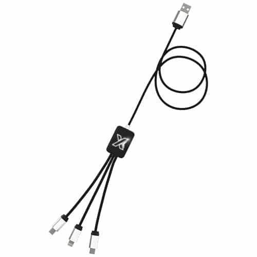 Cavo di ricarica con logo luminoso, finitura in gomma e dotato di tre connettori (tipo C, Android, iPhone). È possibile caricare fino a tre dispositivi contemporaneamente. Lunghezza dei cavi (spine incluse): 10 cm. Lunghezza totale del cavo: 1 metro. Cavo in plastica PET riciclata ed’imballaggio prodotto in carta e plastica riciclata. Un prodotto che combina stile e utilità promozionale.