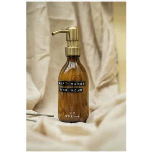 Elegante dispenser in vetro (250 ml) per il bagno, la cucina o la toilette. Questo lussuoso dispenser è riempito con crema per le mani vegana al piacevole profumo di bambù che deterge e si prende cura delle tue mani. Il bellissimo vetro marrone in combinazione con il dosatore in ottone e il testo “Soft hands kind heart” abbellisce qualsiasi interno. Al termine, il dispenser può essere facilmente ricaricato. Prodotto nei Paesi Bassi. Ideale per consolidare la presenza del tuo brand.