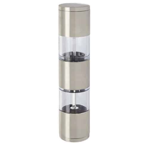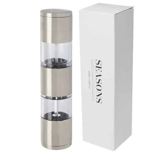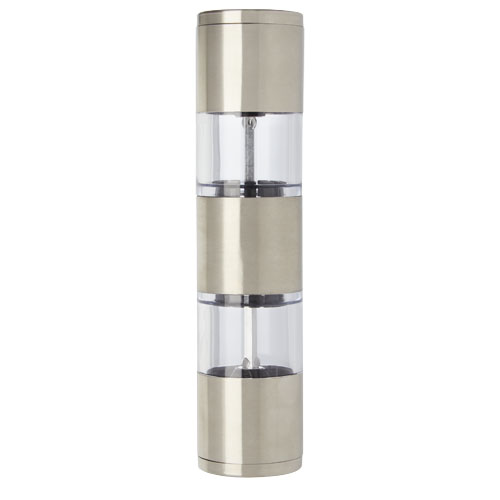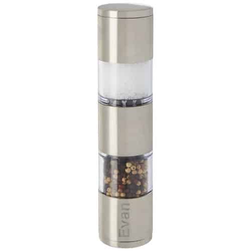 Macinino a doppia funzione con un’estremità per il sale e l’altra per il pepe. Pepe e sale non inclusi. Perfetto come omaggio in fiere e conferenze.