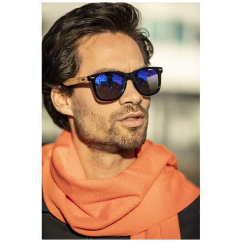 Gli occhiali da sole Hiru in PET riciclato/legno sono prodotti con materiali ecosostenibili seguendo i più elevati standard di qualità. La montatura presenta una finitura lucida e colorata di elevata qualità, realizzata in plastica PET riciclata. Le stanghette, leggere e comode, sono realizzate in legno di rovere proveniente da fonti ecosostenibili, responsabili dal punto di vista ambientale e sociale. Le lenti di colore blu sono specchiate e polarizzate per schermare la luce del sole: gli occhiali sono perciò ideali per guidare l’auto oppure da indossare durante le attività all’aperto, in estate e in inverno. Questi occhiali sono conformi alla norma EN ISO 12312-1 e presentano lenti UV400 classificate come categoria 3. Consegnati con un panno di pulizia prodotto in plastica PET riciclata (15 x 15 cm) e una confezione regalo in cartone riciclato (16,5 x 6 x 4 cm). L’incisione laser è consigliata come opzione di decorazione ecosostenibile. Perfetto per kit di benvenuto aziendali.