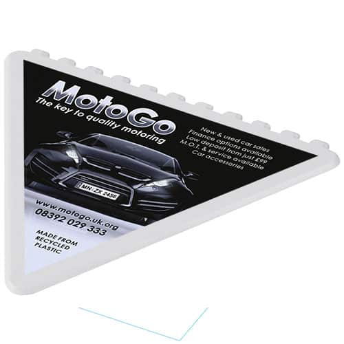 Raschia ghiaccio triangolare per parabrezza con ampia area per la personalizzazione. Ciascuno dei 3 lati puo essere utilizzato per rimuovere il ghiaccio dal parabrezza. Prodotto nel Regno Unito con plastica riciclata. Il raschia ghiaccio presenta una finitura screziata dovuta alla natura del materiale riciclato. Valorizza la tua azienda con un gadget distintivo.