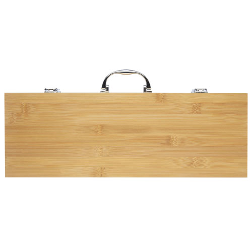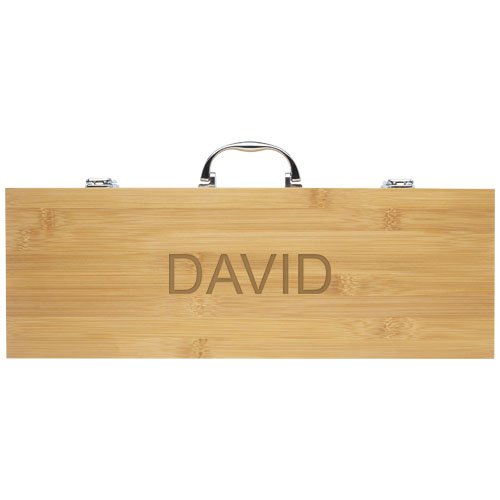 Set da barbecue in bambù composto da 5 pezzi: spatola (40 x 9,5 cm), pinza (34,5 x 6 cm), forchettone (38,5 x 3 cm), coltello (38,5 x 3 cm) e spazzola (38 x 4,3 cm). Il set viene consegnato in una confezione regalo in bambù (46 x 16,2 x 7,4 cm). I manici e la confezione regalo sono realizzati in bambù ottenuto e prodotto in base a standard ecosostenibili. Un gadget che cattura l’attenzione in ogni contesto promozionale.