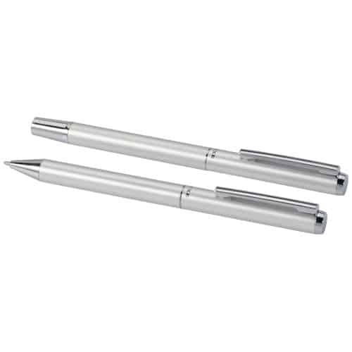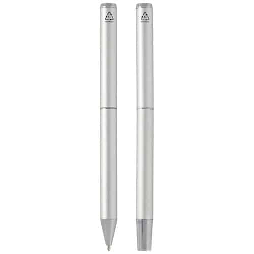 Set regalo con penna a sfera e penna roller in alluminio riciclato Lucetto. Accessorio promozionale originale, disponibile in diverse varianti. Adatto a campagne pubblicitarie mirate e a iniziative stagionali. Offre grande spazio per la personalizzazione del logo e per diffondere il brand.