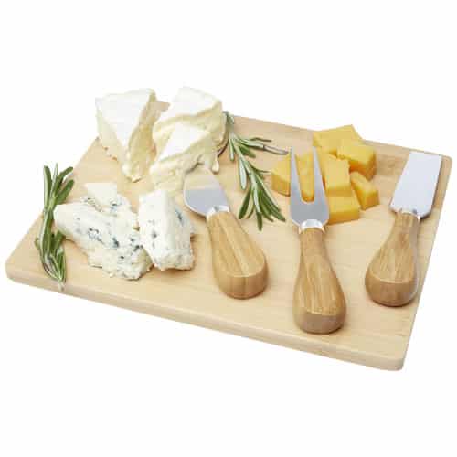 Servire un piatto di formaggio dopo un’ottima cena è sempre apprezzato e questo set ha tutto quello che serve. Il set è composto da un tagliere per formaggio di bambù (22,8 x 18 x 1 cm), un coltello da formaggio standard (12,5 x 2,5 cm), un coltello da formaggio di forma rettangolare (12,5 x 2,7 cm) e una forchetta da formaggio (13,5 x 2,4 cm). Il bambù utilizzato è ottenuto e prodotto in base a standard ecosostenibili. Perfetto per kit di benvenuto aziendali.