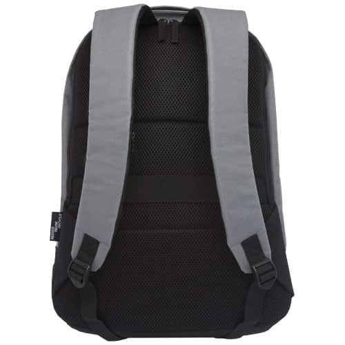 Zaino in RPET certificato GRS che dispone di scomparto principale aperto con pannello divisorio, custodia per portatile da 15″ imbottita e 2 tasche con protezione RFID. Porta USB sul lato destro per collegare e caricare facilmente i dispositivi dall’interno. Dispone di spallacci imbottiti, tracolla per spalla destra, tasca nascosta con cerniera, maniglia e passante per trolley. Per realizzare questa borsa, sono state riciclate circa 15 bottiglie di plastica. Ottimo per promozioni stagionali e campagne marketing.