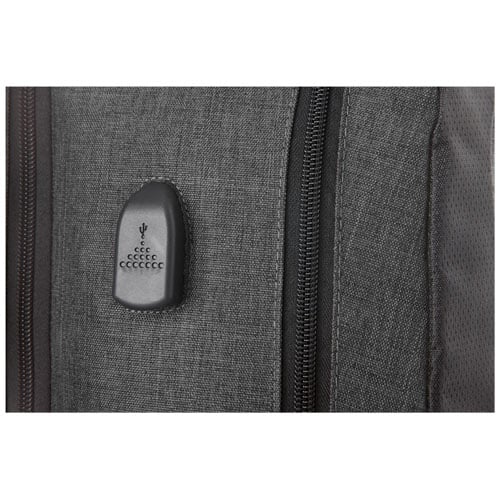 Un elegante zaino per portatili da 17 con porta USB e cavo. Dotato di protezione RFID nella tasca laterale e di tasche aggiuntive con cerniera. Le maniglie superiori e frontali, insieme agli spallacci imbottiti lo rendo facile da trasportare. Sono possibili piccole variazioni di colore nel prodotto effettivo a causa della natura dei coloranti dei tessuti, delle trame e della stampa. Valorizza la tua azienda con un gadget distintivo.